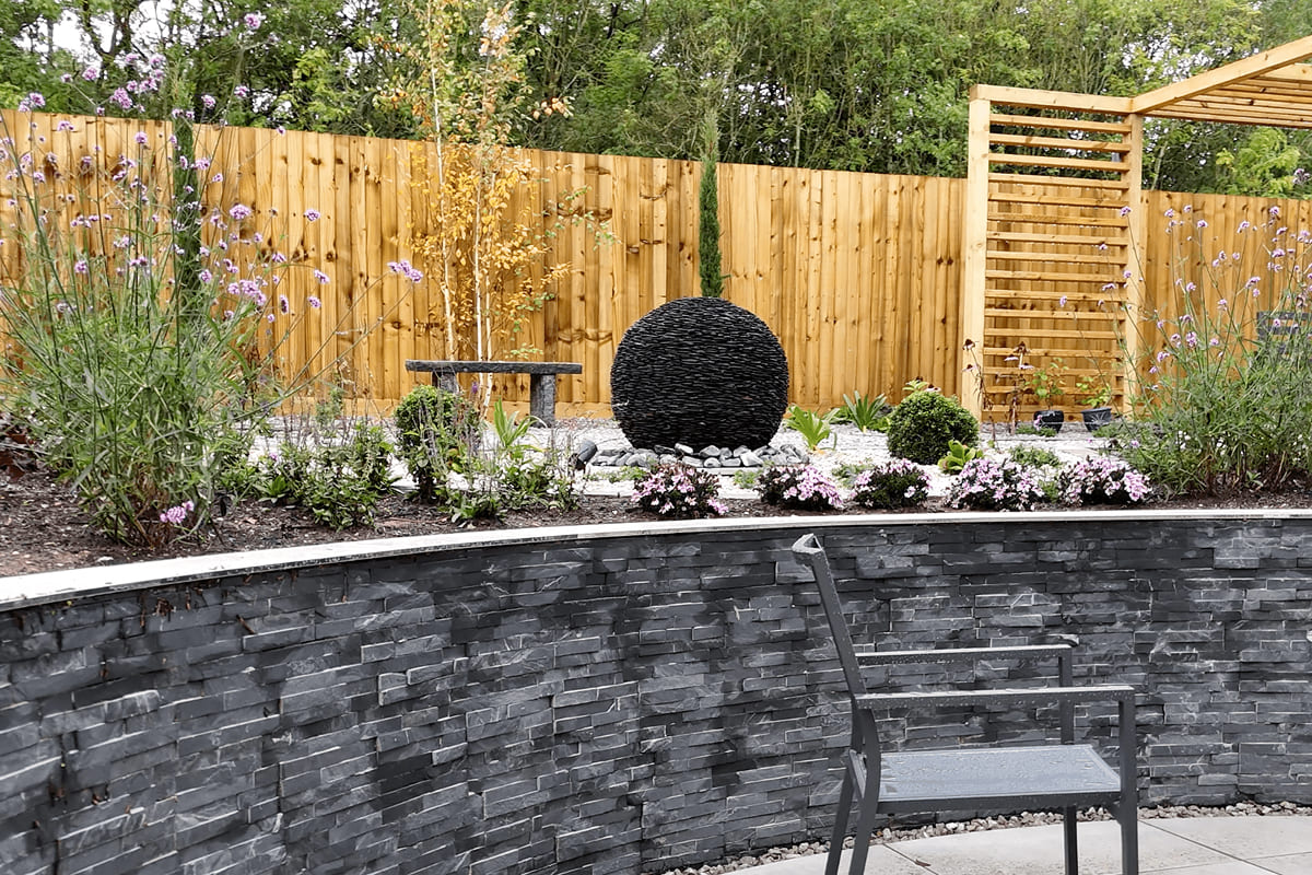 A contemporary space with a beautiful new feature patio, steps up to the top terrace and a couple of bijou eating areas The garden now takes the client on a beautiful journey through the garden with numerous points of interest complimented by well thought out and varied planting.